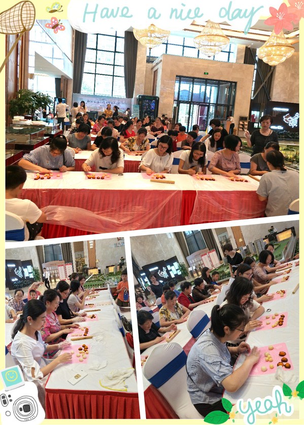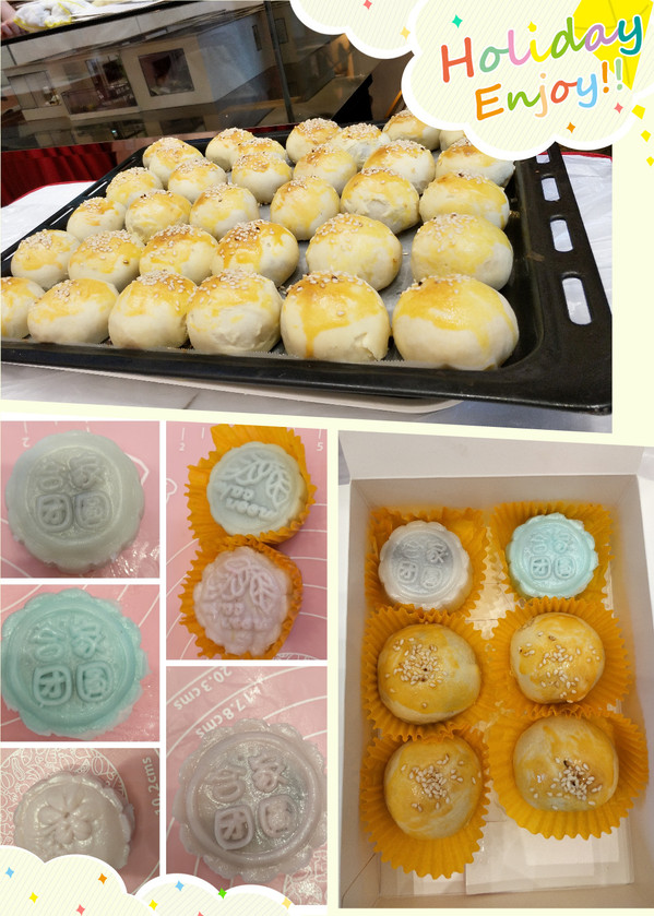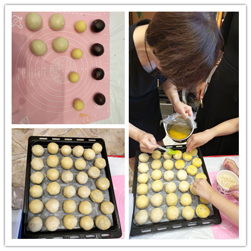 在面点师细致的演示和讲解下,大家手持DIY月饼所需的工具,揉面、擀皮、包馅、点缀黑芝麻、上蛋清、压花,依照各个环节的工序操作,忙得不亦乐乎。当第一盆新鲜出炉口感酥香的蛋黄酥月饼出炉时,大家交口称赞都说味道好极了,并为自己的劳动成果而感到自豪!当老师们尝到了亲手制作的冰皮月饼时,都互相展示、评价,现场洋溢着喜悦和甜蜜。