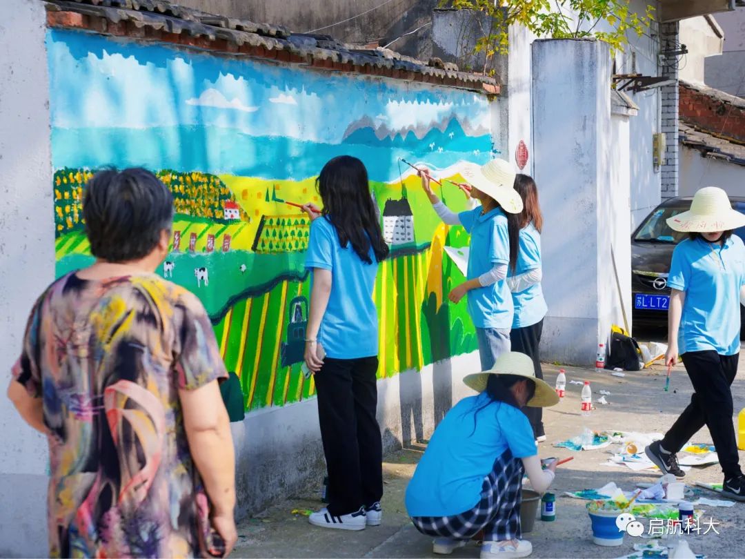 上午九时,大学生实践团来到宝堰村,精心创作、绘制3幅精美墻画。主题为“美丽新农村”“民族要复兴,乡村必振兴”…。在宝堰村村委会的大力支持下,实践团成员们明确分工,配合默契,结合“丰收”“和谐”“文明”等主题,用巧手点缀白墙黛瓦;用山水、人物等多种绘画元素将创新、协调、绿色、发展的理念融入乡村振兴美丽画卷。