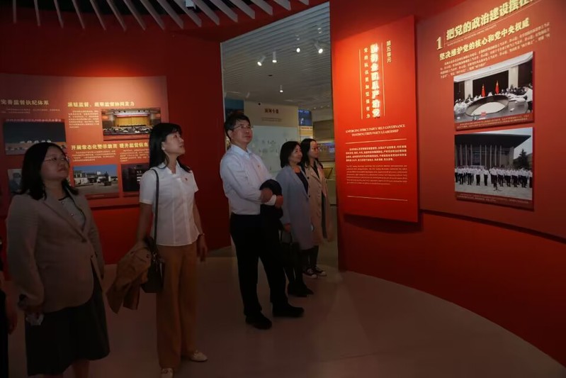 随后在讲解员的引导下,支部党员观看“习近平新时代中国特色社会主义思想指引下的苏州实践”主题展。该主题展分为伟大思想引领伟大航程、建设展现“强富美高”新图景的社会主义现代化强市、奋进新征程建功新时代三个部分,通过文字以及300余张图片、50余部视频短片、150余件各类实物,生动展现了苏州持续深入学习贯彻习近平新时代中国特色社会主义思想的具体实践和发展成果。支部党员在一块块展板前驻足,认真聆听讲解,用心体悟感悟,共同回顾苏州在融入国家战略、创新引领发展、增进民生福祉、践行绿色发展等方面的探索实践。