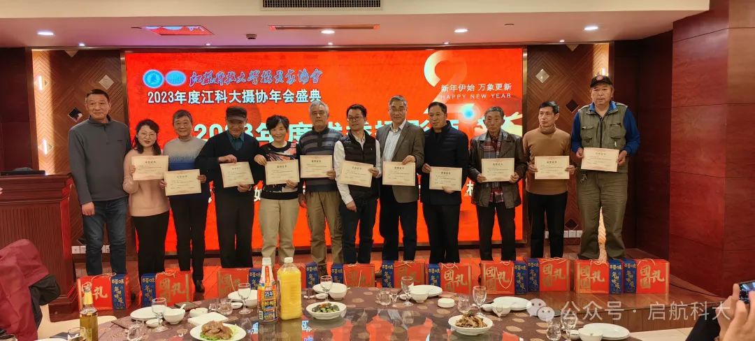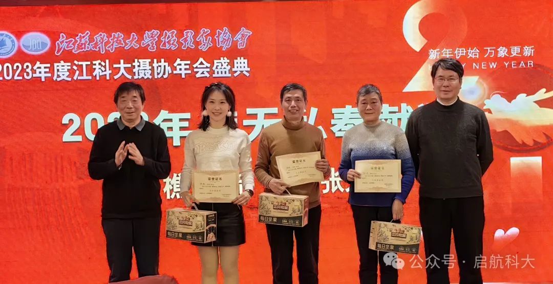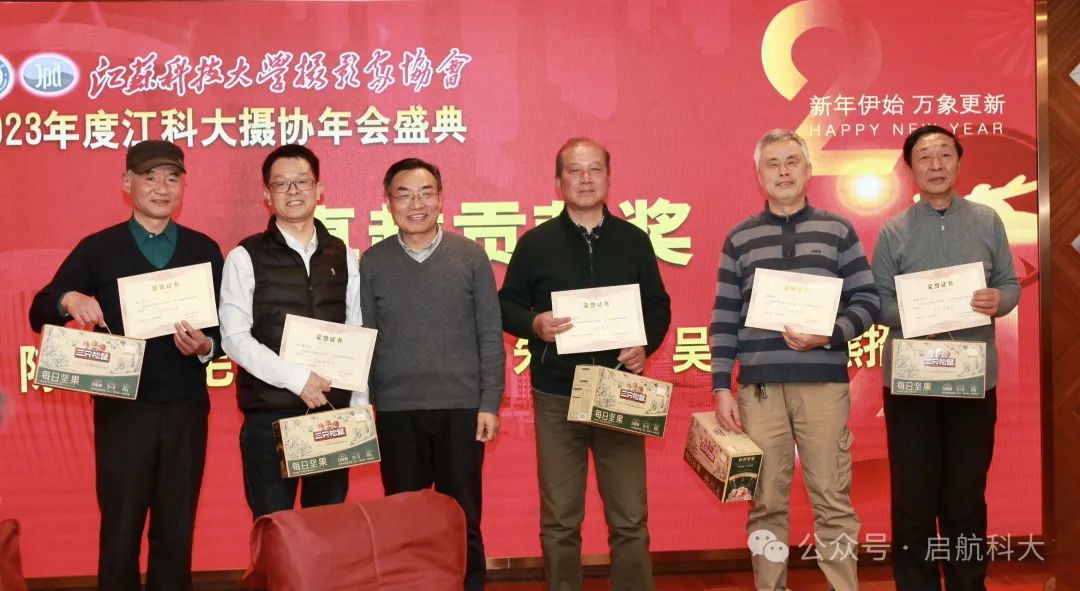 镇江市摄影家协会主席任国卿、原校工会常务副主席魏有章和郭永强、原校党委副书记、工会主席景旭文分别为被协会评为“2023年度优秀摄影师”“无私奉献奖”和“卓越贡献奖”的优秀会员颁发荣誉证书和奖品。