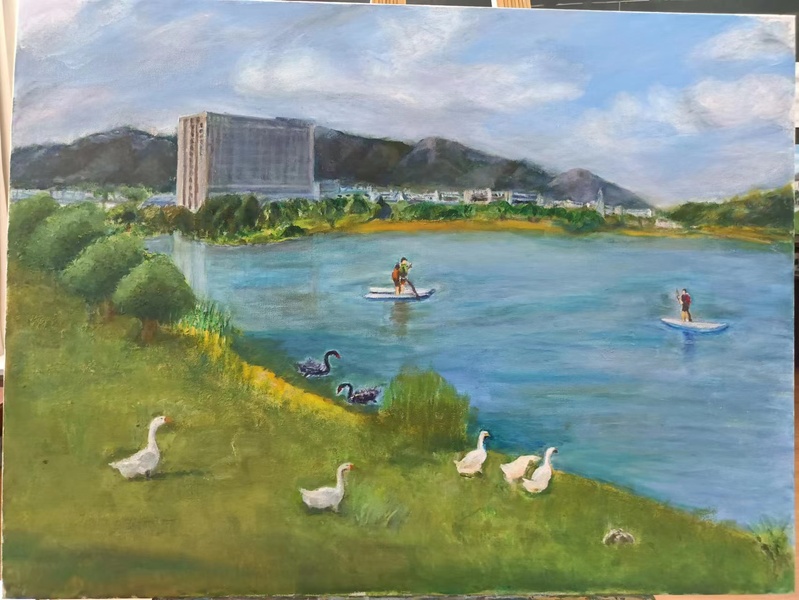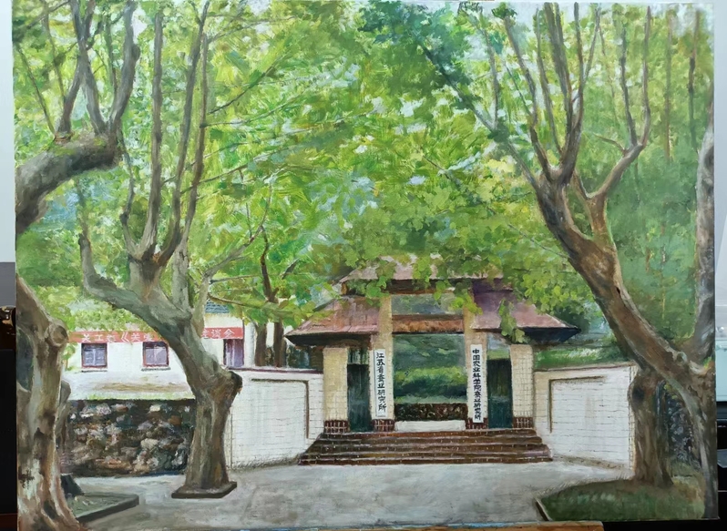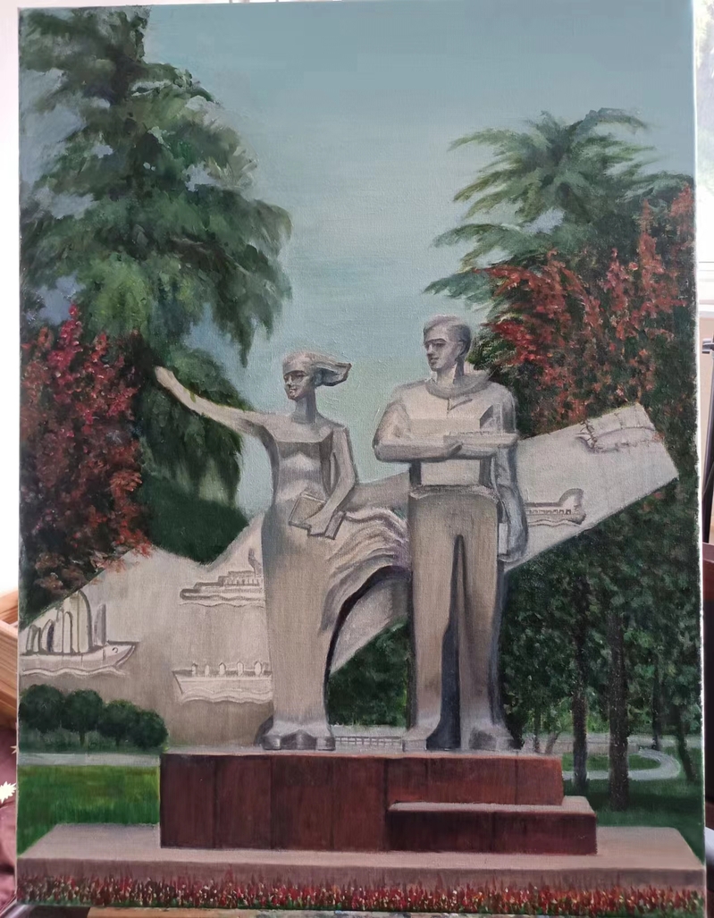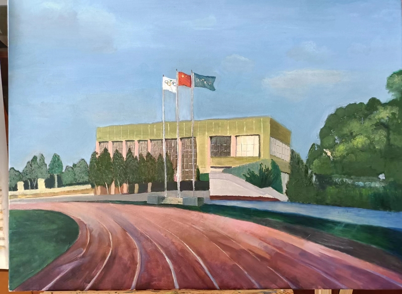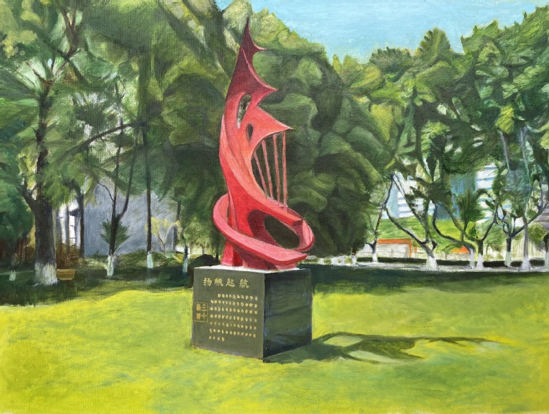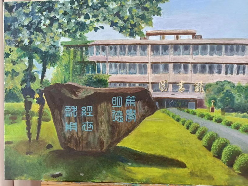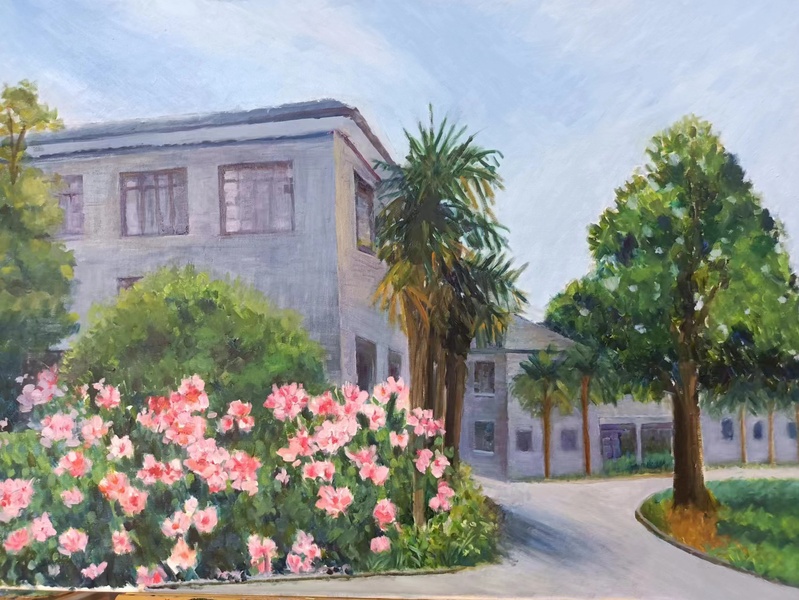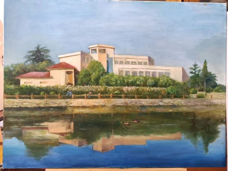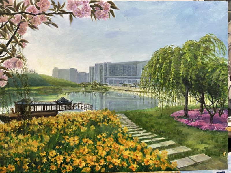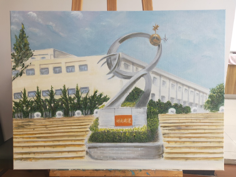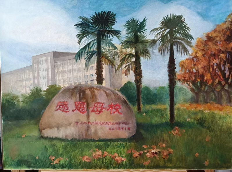 2023年10月26日是 办学90周年校庆日。作为学校员工的协会会员,为了表达对自己供职学校的一份情感,2023年年初就开始为迎接校庆90周年庆典这个特殊的时刻准备自己的画作。终于在校庆庆典前,15幅呈现学校各处独特风景的油画展示于“ 办学90周年校庆书画摄影展”中。不仅如此,用其中的作品特别制作的文化衫还被作为了特别的礼品赠送给了返校的部分校友。而校庆日当天校园里一道独特风景正是身着文化衫的返校校友徜徉于海韵湖边的画面。以下是16幅油画作品的展示和身着文化衫校友的留影: