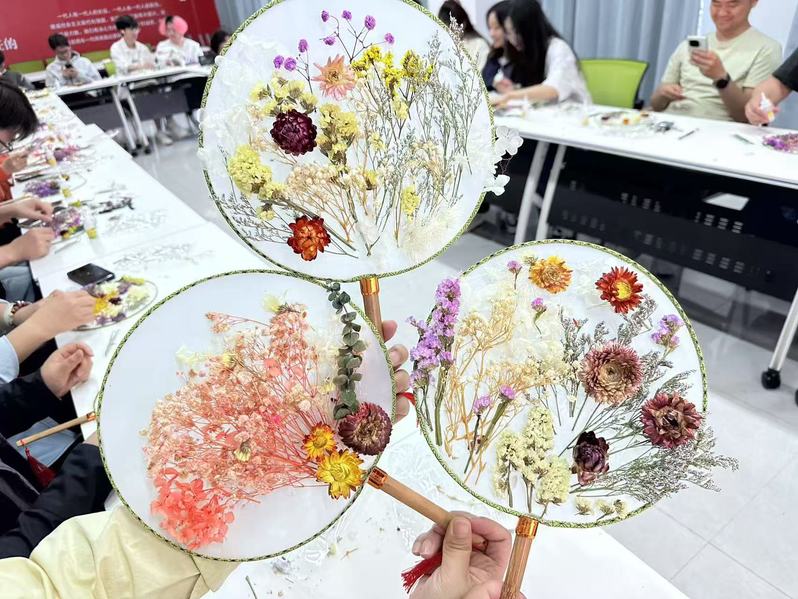 活动伊始,材料学院党委副书记杨海涛为大家介绍团扇的历史文化与美好寓意,作为承载团圆友善、吉祥如意等情感的传统手工艺品,团扇瞬间激发了参与者的浓厚兴趣。现场的老师和同学们,用事先准备好的素面团扇、干花、胶水等丰富材料,按制作步骤各自发挥想象,有人用干花拼出爱心、花朵,有人搭配彩色丝线增添灵动,还有人写下“妈妈:我爱您!”“我要回家吃您做的饭”等表达爱意的语言。现场氛围热烈,老师们现场指导,大家相互协作,同学和老师们认真专注,一把把制作精美、饱含爱意的团扇相继完成。