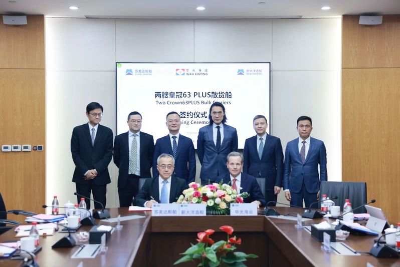 4月23日,苏美达船舶有限公司(以下简称“船舶公司”)与香港船东华光海运控股有限公司(以下简称“华光海运”)在南京苏美达大厦签署战略合作协议,双方同时签署两艘皇冠63 PLUS新造船合同。华光海运执行董事长赵式庆,苏美达集团经营管理部总经理郑中,苏美达集团战略投资部副总经理(主持工作)周强,船舶公司董事长何隽和副董事长徐钢等参加仪式。
