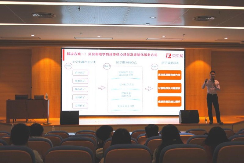 宣讲会内容大致分为学长的创业经历、贝贝帮的运营情况、各岗位职责及要求的介绍、同学提问4个环节。在第一环节中,徐鹏学长分享了他从大学期间跑宿舍卖移动卡赚到人生第一桶金、设计校园占座宝直到创建贝贝帮这一过程的创业经历,也畅谈了自己在创业过程中遇到挫折时的心路历程,对此他表示:创业成功的经验是在不断突破、不断实践中一点一滴积累而成的。接着,他主要介绍了贝贝帮各方面的运营现状、贝贝帮相较于其他教育平台的突出优势以及贝贝帮未来的发展趋势和方向,他总结到:创业需要创新和突破,青年的成长经历亦如此。