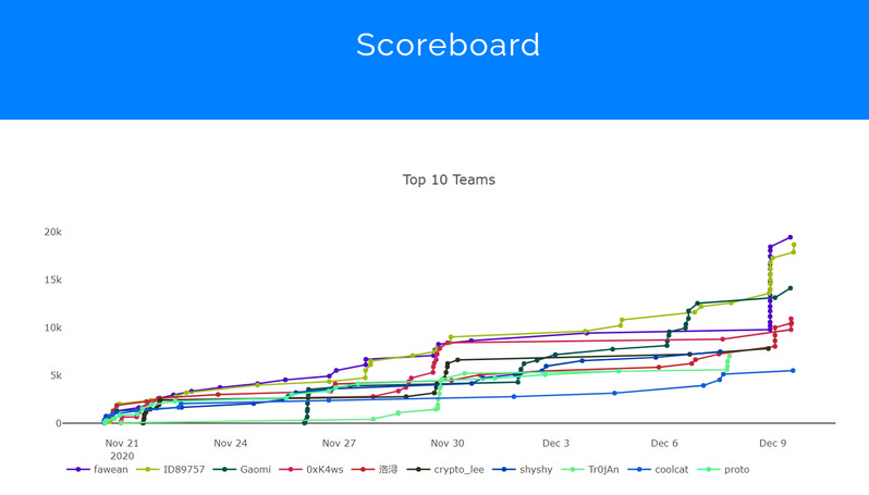 从11月20日到12月9日,选手们或在闲余的时间,或利用自己的娱乐时间在网上学习新知识,并用新学知识来解题,全面调动了参赛人员包括大一大二的新生或初学者的学习积极性。在比赛持续的10多天里,选手们起初密集在一起上分,然后随着每天题目难度的增加,出现了你争我逐的良好竞争现象,特别是到了比赛结束的紧要关头,出现了大幅度的竞争波动,几位选手垂直上分,不相上下。尤其是暂时分列第一、第二的黄照然和卢星宇,在比拼分数之后,虽然卢星宇落后些许,但是最后结束前全力一击,但不料黄照然早有准备,在最后一天又成功攻破了一道题,使得卢星宇在紧要关头虽然连追两道题但还是惜败,最终黄照然守住了第一的宝座。