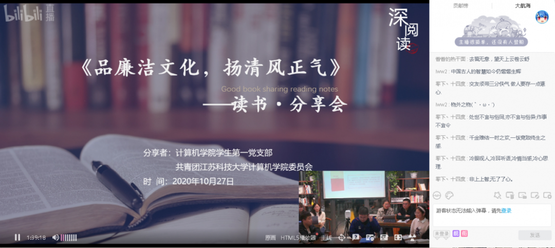 在阅读分享环节,五名同学畅谈了自己对“廉”的理解和实践心得。院学生第一党支部的李锦浩、范佳乐、崔严三名党员分别朗诵了《红岩》、《菜根谭》与《守住底线——69封廉政家书》三本书的部分经典段落;而优秀团员代表赵晨宇、海米旦都选择了《钢铁是怎样炼成的》这本书,节选不同片段,诵读并发表了自身的阅读感悟。阅读期间,聆听的同学们也畅所欲言,互动说“廉”,分享自己对于书中“廉洁”概念的理解。最后,张老师总结,“以前读过的书通过朗读又有了不同的感悟,对书中的内涵也有了更深的理解。本次的读书会以朗读的传统形式结合线上直播的新方式,重温经典、汲取正气。”