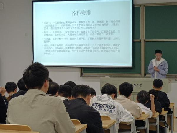 张振山,拟录取于,攻读软件工程专业的专硕学位。张振山主要分享的是考研院校选择以及个人建议,他用幽默的话语给予了在场同学许多宝贵的意见,比如在各科备考中要有轻重之分,有些科目要下狠功夫去攻读,英语要着重于背单词等建议。