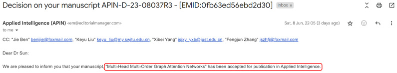 近日,我校计算机学院2021级计算机科学与技术专业本科生贲杰,以第一作者身份撰写的《Multi-Head Multi-Order Graph Attention Networks》研究论文被国际知名期刊《Applied Intelligence》(中科院二区,中国计算机学会推荐C类,影响因子:5.3)录用, 为第一署名单位,学院专职教师孙柒国博士为论文通讯作者,杨习贝教授为论文合作作者。这是我院数据科学与知识工程研究所杨习贝教授团队在图神经网络研究领域获得的又一研究进展,展现了我院在本科生科技创新能力和人才培养方面上取得的显著成效。