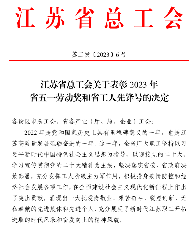 4月27日,江苏省总工会下发《关于表彰2023年省五一劳动奖和省工人先锋号的决定》(苏工发﹝2023﹞6号)文件,对过去一年爱岗敬业、艰苦奋斗、锐意创新、无私奉献的先进集体和先进个人进行表彰。我校机械工程学院被评为“江苏省工人先锋号”。