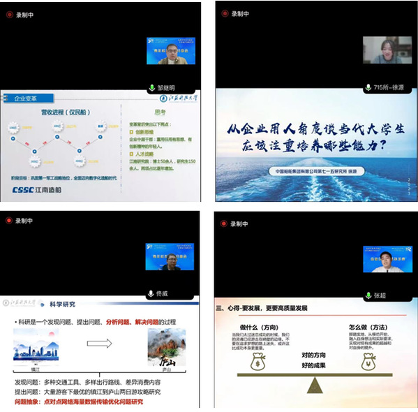 分享会上,邬继明结合江南造船集团的企业变革案例和自己参与9400箱集装箱船、东方红3号科考船、375KLEG液化气船等多型全球首制传的研发与设计工作经历,对同学们专业学习、毕业方向选择和职业发展提出建议;徐源用数据展现了如今牛业生求得良职的不易,并从企业用人的角度与同学们分享了大学生应该注重培养自己的哪些能力;佟威分享了自己科研路上的经历感悟,强调研究生应江重培养分析问题、解决问题的能力以及创造价值的动手能力 ,做到“一专多能”;张超分享了自己大学生活中科研经历、兴趣爱好以及学生组织经历,鼓励同学们要明晰目标、找准方向、融入团队,和身边志同道合的小伙伴们不断实现自我突破与蜕变。