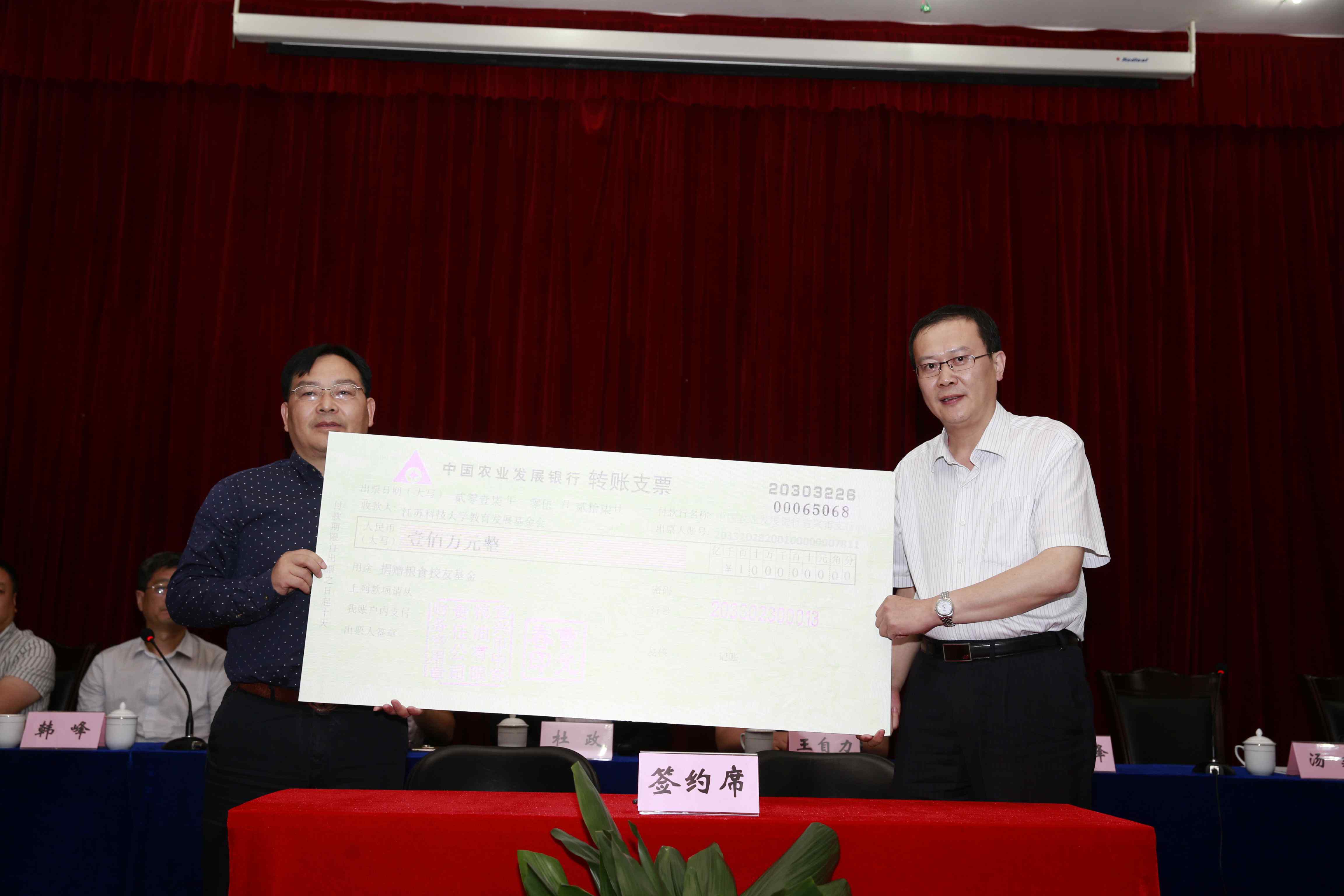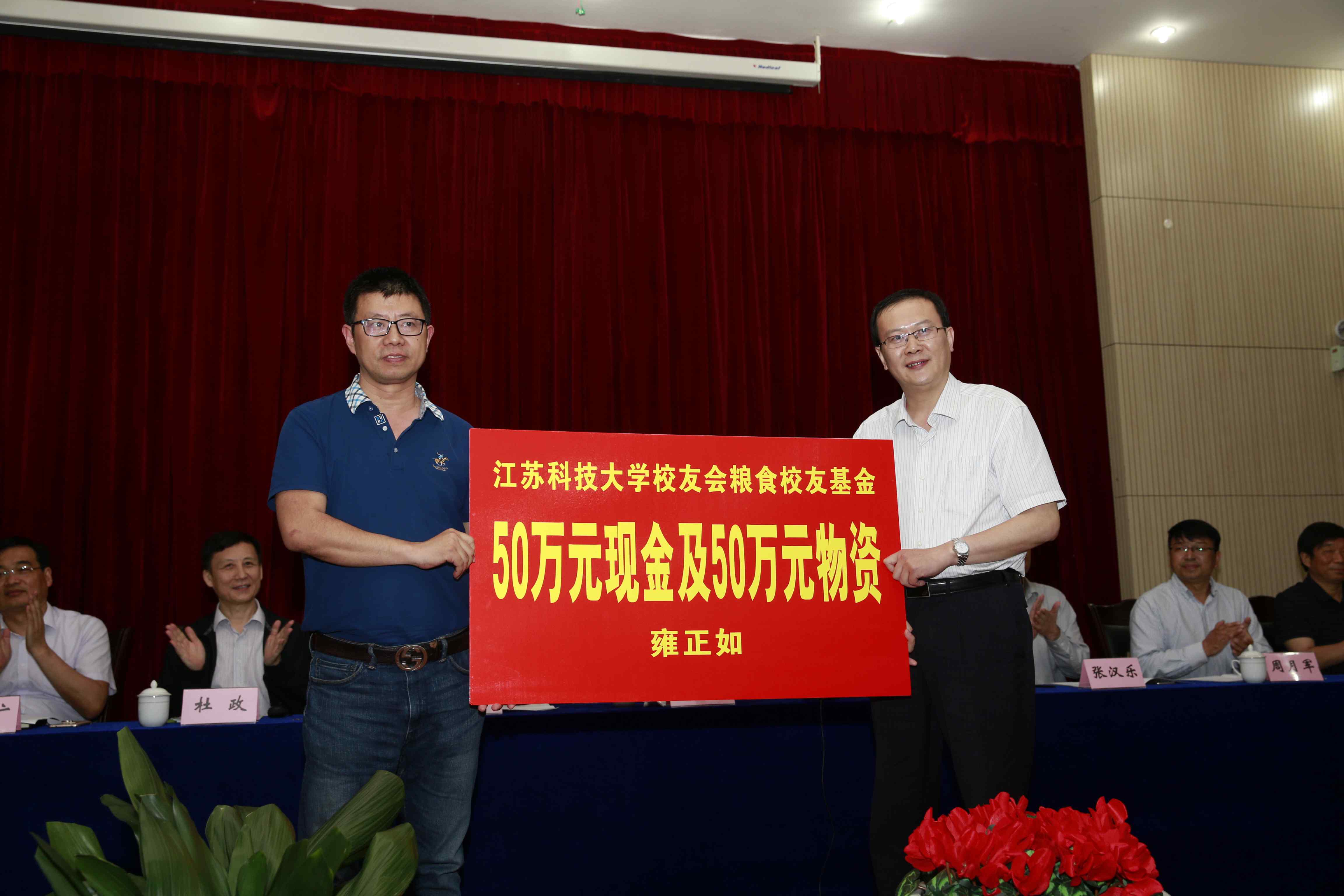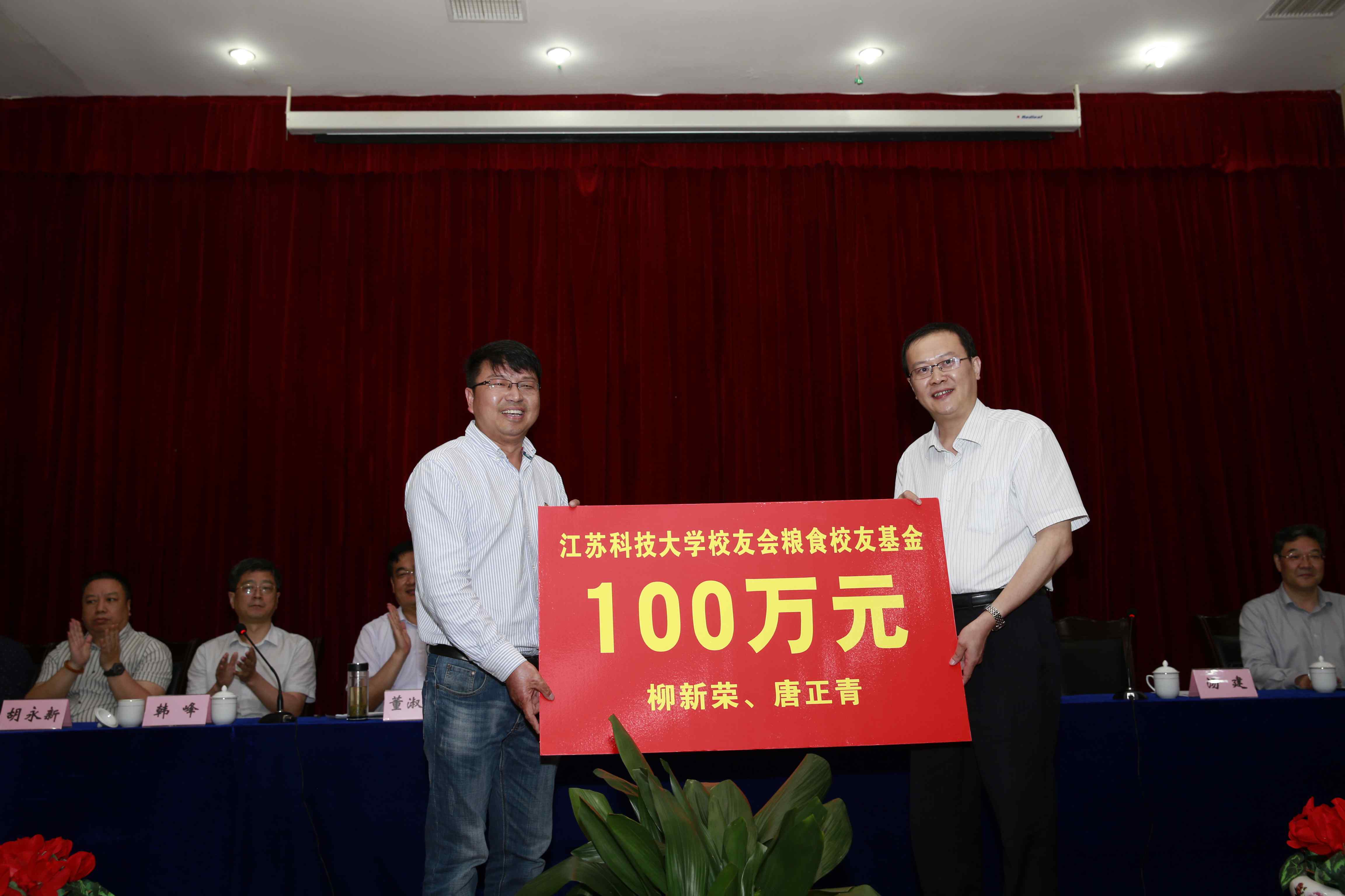 10日, 副校长汤建与南京铭和医院投资管理公司张汉乐董事长签订《铭和教育奖励基金捐赠协议书》,张汉乐向 粮食学院捐赠100万元;与宜兴市中谷粮油有限责任公司曹光春董事长签订《粮食校友基金捐赠协议书》,曹光春向 校友会粮食校友基金捐赠100万元;苏州佳禾食品有限公司董事长柳新荣携夫人唐正青向 校友会粮食校友基金捐赠100万元;江苏雍年堂食品股份有限公司总经理雍正如向 校友会粮食校友基金捐赠50万元现金和50万元物资;校友班级代表8311、8321班分别向 校友会粮食校友基金捐赠5.5万元、6.5万元;校友代表周进华、叶枫、傅振举分别向 粮食学院捐赠书法作品。