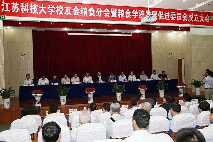 6月10日下午, 校友会粮食分会暨粮食学院发展促进委员会在江科大南校区成立。国家粮食局科学院院长杜政,江苏省粮食局党组成员、人事处处长董淑广,江苏省农业资源开发局副局长赵海峰,江苏省粮食局副巡视员韩峰,江科大校长王自力、副校长汤建等出席成立大会。