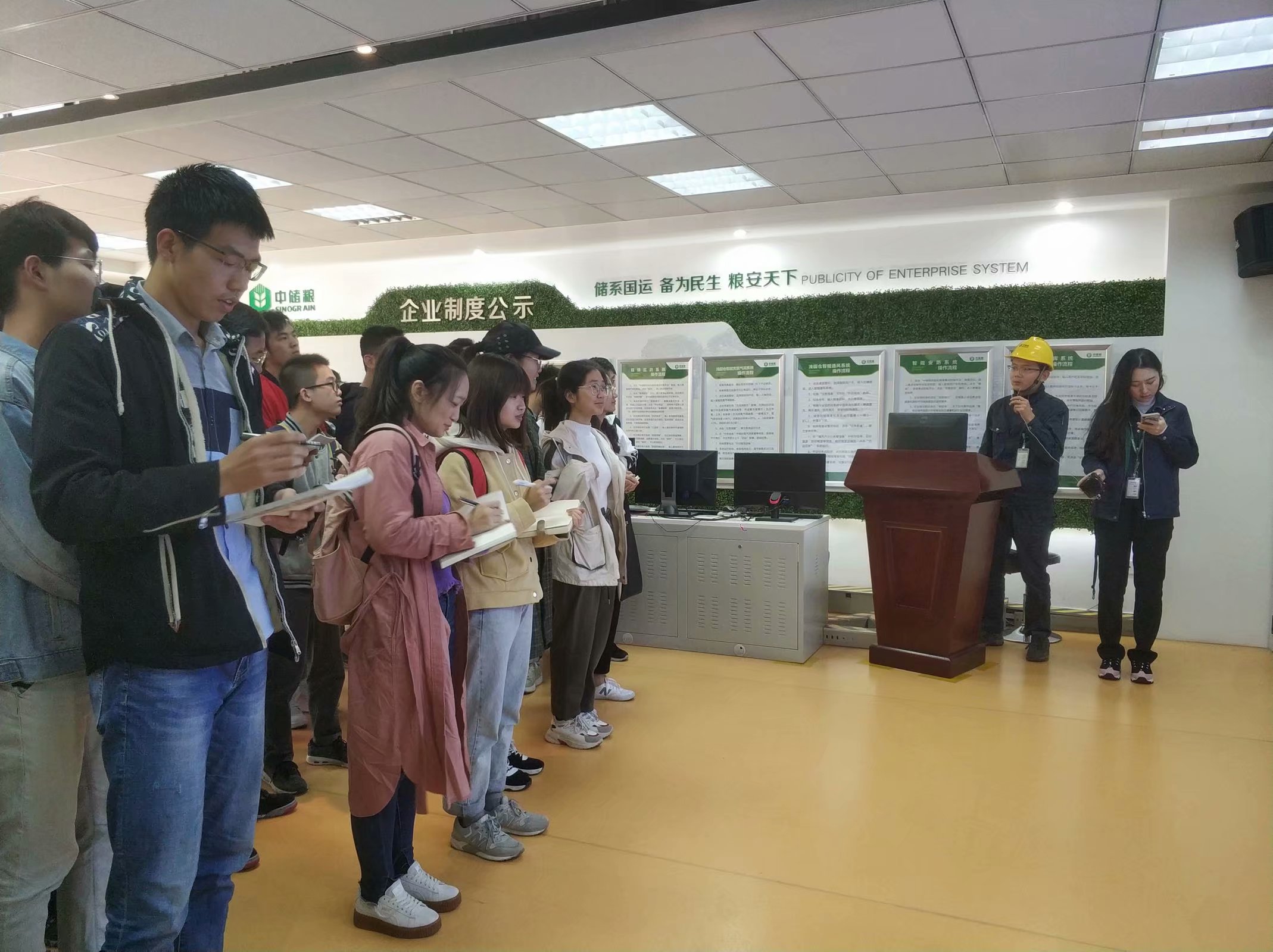 在基地信息中心里,工作人员详细地为同学们介绍了智能运行平台在仓储和检验方面的应用,包括其浅圆仓中各项参数所代表的意义及最大温差的含义,让同学们能够更加了解目前现代化、科技化的储粮与检验方式,也对未来的工作前景作出一定的展望。随后,同学们在讲解员的陪同下,参观了中储粮镇江基地的各个工作车间,包括粮油码头及油料仓等。据介绍,其中,油脂油料仓储规模130万吨,油脂油料年加工能力402万吨,拥有长江深水岸线720米,7万吨级粮油码头泊位2个,码头年吞吐能力可达800万吨。