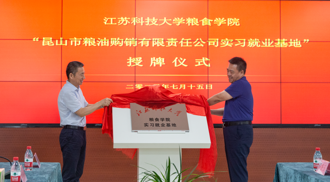 7月15日上午,粮食学院与昆山市粮油购销有限责任公司实习就业基地签约及揭牌仪式在昆山吴淞江储备库举行。昆山市粮食和物资储备局局长王亮、副局长钱小峰,昆山市粮油购销有限责任公司经理张月明、党支部书记嵇文华、副经理张宝明,粮食学院党总支书记梁忠臣、院长鲁玉杰、校友会粮食分会秘书长魏有章、副院长张国昌、副书记赵敏等参加了签约揭牌仪式并进行了座谈。