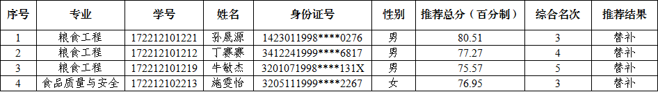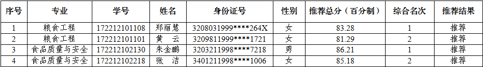 根据《粮食学院关于做好2021届本科毕业生推荐免试攻读硕士研究生工作的通知》和《粮食学院2021届推荐免试研究生工作方案》规定,经专家审查小组对候选人及申报材料进行审查,学院推免生工作领导小组根据综合成绩排序确定推免名单。现将名单公示如下: