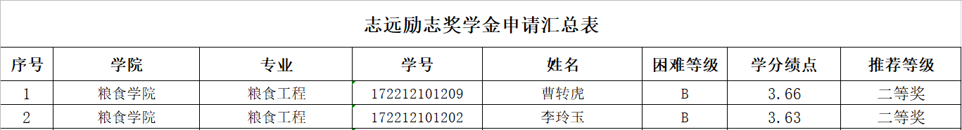 经学生本人申请及评审小组评定等环节,现将粮食学院2019-2020学年志远励志奖学金评定结果公示如下: