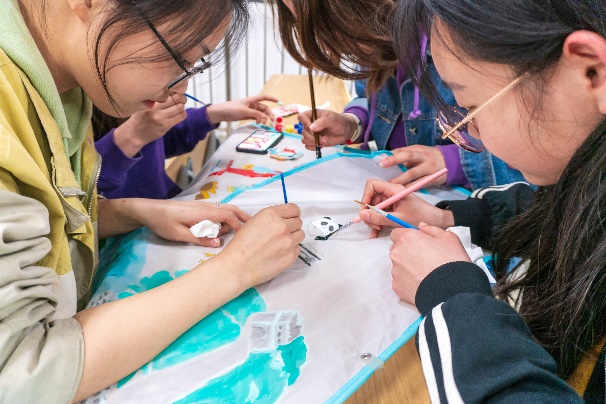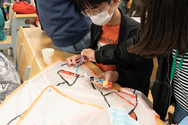 互动游戏过后,迎来了同学们最期待的环节——风筝涂鸦。心理辅导工作站为大家准备了丰富的颜料、风筝、线圈、调色盘、水杯等工具,同学们在空白的纸面上选择自己喜欢的色彩,写上自己对于未来美好的祝愿和鼓励的话语,开始风筝涂鸦大作。在场的同学们有的以手印、脸谱、书法、祥云、白鸽为元素诠释青年心中的中国风,有的以彩虹、礼花为元素表达青年对祖国祝愿,还有的以熊猫、竹子、战斗机型号为元素,诠释了中国特色。不一会儿,一幅幅独特的图案跃然于风筝之上。