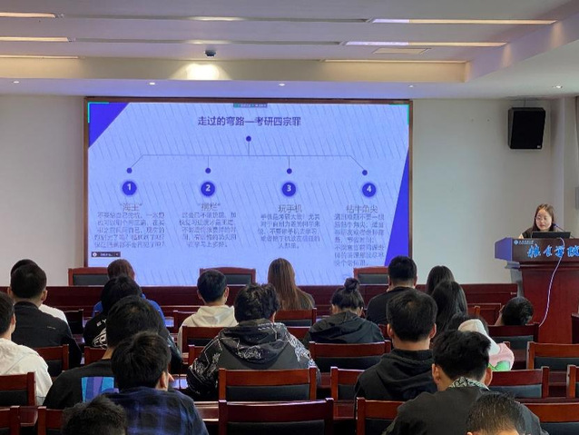 会议伊始,学院年级辅导员武兆文老师简要介绍了2018级考研学子的优秀成绩,考研录取率达42%,暂列全校第一。接着,结合近年的考研数据,为同学们分析了当前的考研形势,全国考研报名人数迅速增长,考研难度加大。武老师建议各位同学科学理性选择学校,最大程度地争取院校录取。
