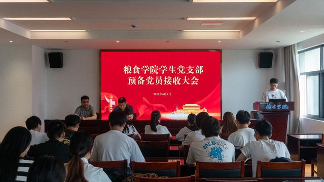 2022年6月9日上午, 粮食学院学生党支部在学院楼440室召开了预备党员接收大会,讨论黄洋、曹静怡、李海峰、孙芸4位同志预备党员接收事宜。应到会党员37名,实到会党员37名,符合会议召开要求,大会由学生党支部副书记柴艺博同志主持。