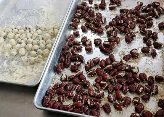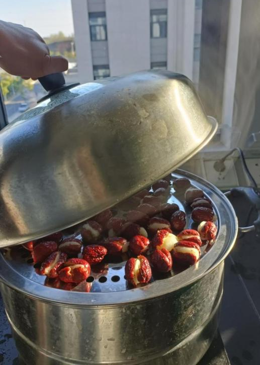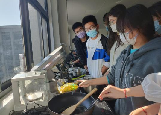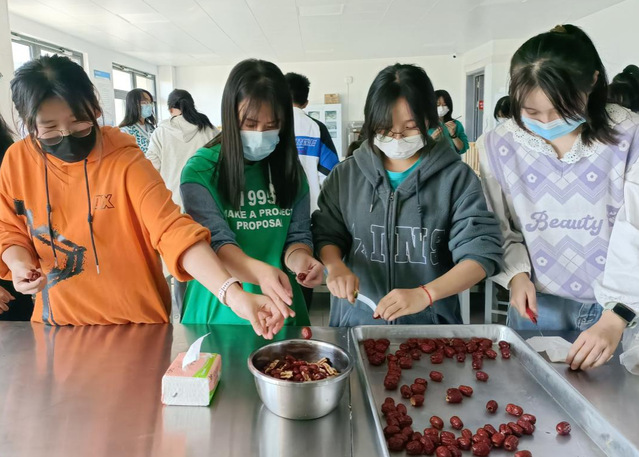 系列主题活动期间,学院食品科学研究协会的同学在学院食品工艺学教室制作奶枣与糯⽶枣。在协会老师的指导下,“去枣核、剥巴旦⽊、揉糯⽶团、融黄油、撒奶粉”等一系列步骤井井有条。不一会儿,一颗颗奶味十足、香飘四溢的自制奶枣就出锅了。师生其乐融融,体验到了不一样的氛围。