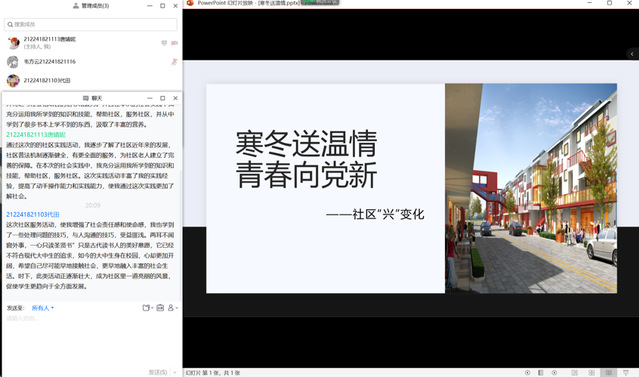 最后,实践团成员就此次寒假社会实践活动进行活动总结,社区人员从细处着手、从心出发,用微笑传递温暖,用服务传递正能量。通过此次社会实践活动,大家深入了解了社会服务的重要性,做好社区服务工作关于提升居民生活质量、扩大就业、化解社会矛盾、促进和谐社会建设都具有重要意义。而作为一名大学生,我们不仅要掌握文化知识,还要具备服务他人、服务社会的能力,培养自己的综合素质,为社区发展贡献力量,促进社区服务工作向更高水平发展。