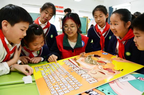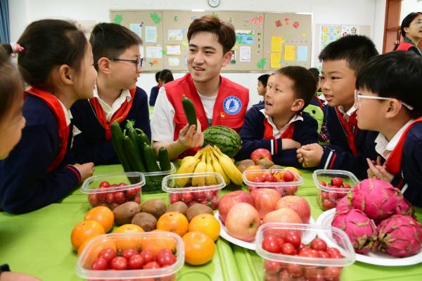 2023年5月18日, 志愿者来到镇江市金山湖小学开展“均衡营养 健康成长”活动,为小学生讲解各种水果、蔬菜的营养价值与科学搭配,指导他们制作水果拼盘,引导孩子树立健康饮食观念,迎接中国学生营养日的到来。