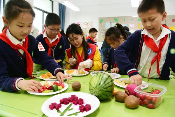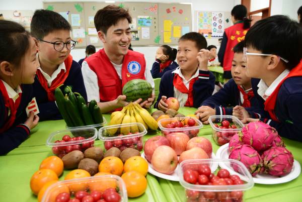 5月18日, 志愿者来到市金山湖小学开展“均衡营养 健康成长”主题教育活动,为小学生讲解各种水果、蔬菜的营养价值与科学搭配。