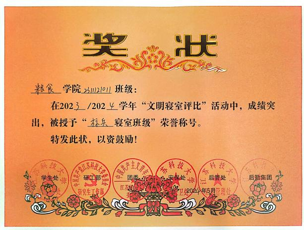 学院注重学生工位学习氛围和宿舍生活氛围营造。2名研究生在校研途万象“最美工位”评选活动中获奖,4个宿舍均被评为2023-2024年度文明寝室,占比100%,班级获“标兵寝室班级”荣誉称号。
