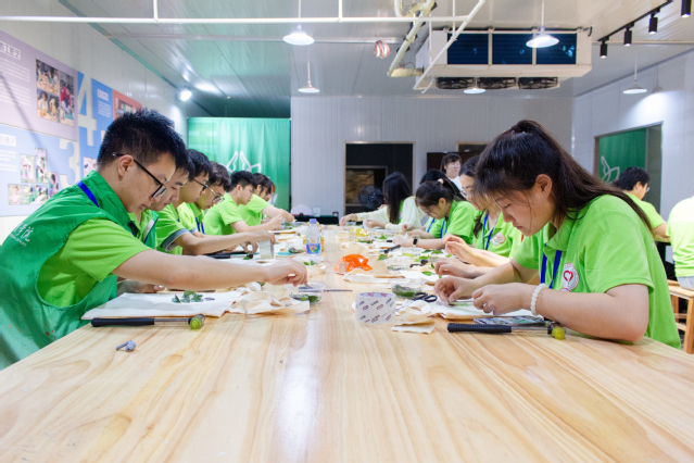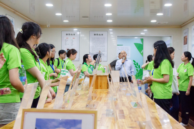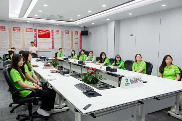 图为营员在中储粮镇江质检中心聆听储粮发展