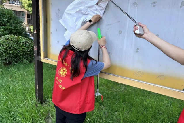 同扫乡村路,共筑新风貌。实践团成员身穿红马甲,手拿抹布、垃圾钳等清洁工具深入垃圾存放点位,开展环境卫生集中清洁行动。对居民区垃圾、杂物、卫生死角进行打扫,对电线杆、村道口“牛皮癣”进行深度清理,并规整乱停放车辆。