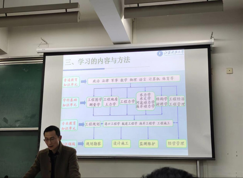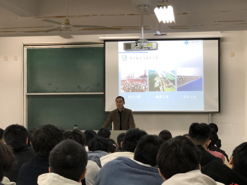 此次新生见面会的主讲人是 船舶与海洋工程学院副院长周效国老师,他从港口航道与海岸工程专业的专业设置背景与发展沿革、专业内涵与特点、专业课程设置和将来就业前景与毕业去向四个方面出发,系统地为港航专业71名新生做了详细的学业指导。会上指出我国的港航专业起步于1915年河海工程专业学校开设的港工学课程,经过83年的时间,在1998年发展成为了如今我们所了解港口航道与海岸工程专业。其中专业涉及面广,对力学、工程制图等基础课程的要求比较高,专业人才的社会需求量多,其主要的就业单位区域主要分布在沿江沿海等经济相对较为发达的地区。最后周老师总结,港口航道与海岸工程专业前景广阔,毕业生可在水运、水利、海洋、土木等热门行业就业,在人才市场上供不应求。