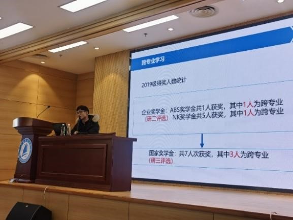 韩越同学作为优秀研究生代表就研究生的学习生活与同学们展开分享,韩越提到跨专业的同学获得奖学金的比例在逐步增大,意味着这部分同学只要通过自己努力,取得的成果不会逊色于本专业同学。韩越给研一同学提出了开始科研的几个步骤,第一步是要热爱学校,了解专业,明确目标。要多与同课题组的导师同学交流,和本科的同学交流,包括研究方向、就业去向等问题。要细读研究生手册,明确自己的目标。第二步是认真上课,自主补修,结伴交流。韩越推荐了 网络教学平台,供跨专业的同学们补修使用,并强调课题组内要多交流,多帮助,以形成良好的科研氛围。