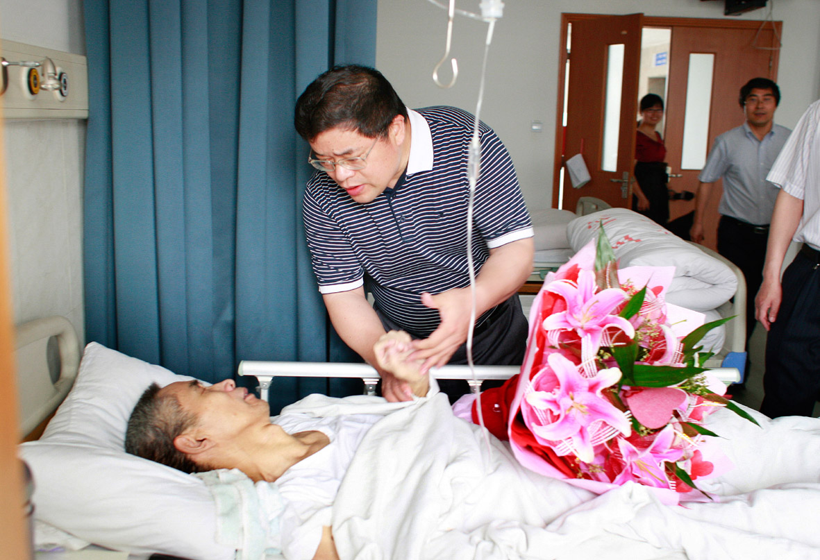 “景老师爱岗敬业,无私奉献,是我们教师中的典范。江科大的老师和同学们都牵挂着您,让我们转达对您的无限祝福……”校长王自力教授伸出双手紧紧地握住景教授的双手,无尽情谊饱含其中。纪委书记夏纪林、副校长许俊华以及各职能部门的负责人也纷纷来到景教授的病床前,与景教授亲切交谈,表达了对这位平凡而伟大的教师的崇高敬意。