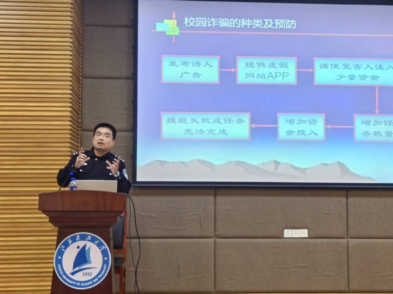 为深入贯彻党中央关于强化青少年法治教育的重大指导精神,积极响应国家关于构建平安中国、法治中国的战略部署,切实增强学生的安全意识。11月21日下午,船海学院“蓝途”学生社区成功举办“定锚·铸船魂起航工程——新生法制安全教育专题讲座”。此次讲座由镇江市公安局丹徒分局长山派出所副所长娜晟东担任主讲嘉宾,针对船海学院2024级全体新生进行了深刻且富有教育意义的安全警示宣讲。
