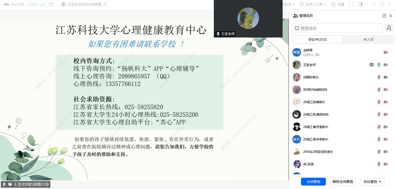 为构建多元协同的心理健康支持体系,推动家校医联动机制走深走实,由 心理健康中心主办、船舶与海洋工程学院承办的“家校医同行,共育心成长”线上主题活动顺利举行,活动聚焦家校医三方联动,旨在凝聚多方合力,共同守护大学生心理健康,助力学生全面发展。本次活动由船舶与海洋工程学院心理辅导员王荃主持,学院党委副书记巫蓉出席,2024 级本科生、研究生辅导员及全体新生家长通过云端平台共同参会。