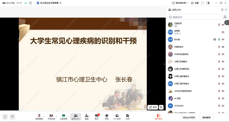 活动特别邀请镇江市心理卫生中心张长春主任作《大学生心理疾病的识别与预防》专题讲座。张主任结合临床案例,系统解析了神经症、抑郁症等常见心理障碍的典型特征,重点强调心理疾病≠精神病 的科学认知。他指出,心理问题诱因多样、隐蔽性强,需要家庭、学校与专业机构协同干预,尤其应高度关注自残与自杀行为的预警信号。对此,张主任提出情绪调节、亲子沟通等方面的实用建议,强调家庭在心理支持中的关键作用。整场讲座内容专业、贴近现实,引发家长强烈共鸣,为更好地守护学生心理健康提供了有益指导。