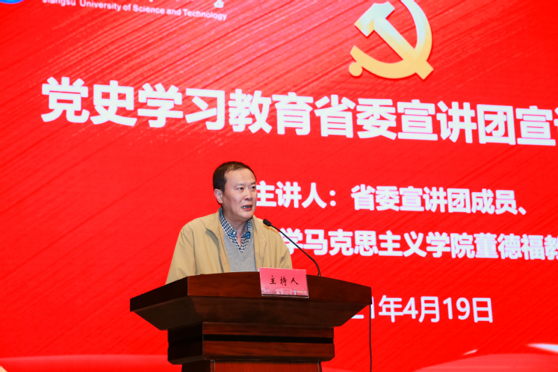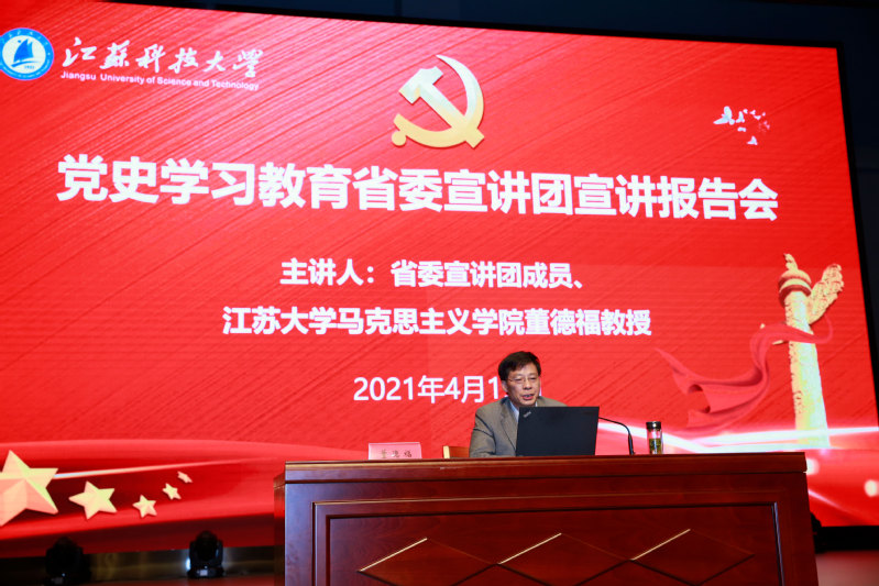 4月19日下午,党史学习教育省委宣讲团在 进行宣讲,省委宣讲团成员、江苏大学马克思主义学院教授董德福作宣讲报告。本次宣讲报告主会场设在长山校区船苑剧场,分会场设梦溪校区演讲厅和张家港校区、苏州理工学院文心会堂。校领导周南平、景旭文、许俊华、俞孟蕻、郑培钢、嵇春艳出席报告会。全校科级以上干部、马克思主义学院全体教师、全体辅导员、学生党员、入党积极分子等聆听宣讲报告。党委常委、副校长汤建主持宣讲报告。
