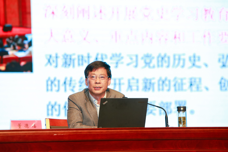 董德福教授以《从百年党史中汲取前行的智慧和力量》为题进行宣讲。报告紧密结合习近平总书记在党史学习教育动员大会上的讲话内容,从“学史明理,明晰历史必然;学史增信,增强历史自信;学史崇德,赓续精神血脉;学史力行,践行初心使命;以正确的党史观学习党史”等五个层面进行详细讲解。通过鲜活的案例阐述了中国共产党为什么“能”、马克思主义为什么“行”、中国特色社会主义为什么“好”。深入解读中国共产党百年奋斗史的宝贵经验和读懂百年大党的成功“密码”。董德福教授强调要把学习党史同总结经验、观照现实、推动工作结合起来,同解决实际问题结合起来。通过原原本本学、开展实地研学、为师生办实事等方式,确保党史学习教育取得实效。宣讲报告视野开阔、深入浅出,让广大师生深化对习近平总书记关于党的历史重要论述的理解,进一步领会党的百年奋斗历史、深入开展党史学习教育具有重要指导意义和借鉴意义。