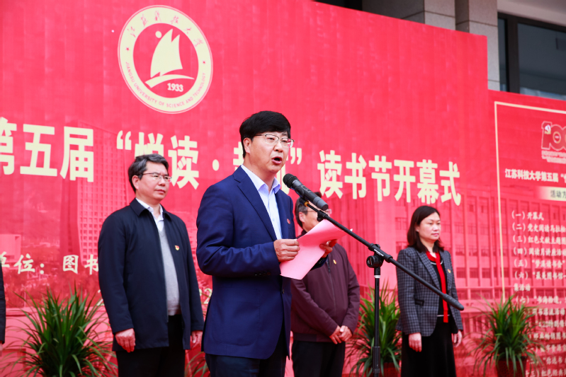 为庆祝中国共产党成立100周年,引领师生诵读百年党史,传承红色经典,4月22日下午,在第26个“世界读书日”到来之际, 第五届“悦读·起航”读书节开幕式暨党史阅读马拉松挑战赛启动仪式在长山校区图书馆南门隆重举行。校党委副书记、副校长景旭文,校党委常委、宣传部长周春燕出席开幕式。学生处、工会、团委等职能部门负责人,图书馆全体馆员、党史阅读马拉松参赛选手、读者协会会员以及师生代表一同参加了开幕式。开幕式由图书馆党总支书记王明强主持。