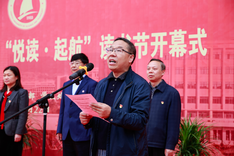 开幕式最后,校党委副书记、副校长景旭文发表讲话,指出学校历来高度重视阅读推广工作,今年又值中国共产党成立100周年,通过举办本次读书节活动,将党史学习教育与阅读推广相结合,能够很好地创新党史学习教育形式,弘扬爱国主义精神,引领广大师生一起诵读百年党史,传承红色经典。让师生的“爱国、爱党、爱校”情怀深植于心,在书的海洋中破浪前行,共同建设美好校园。
