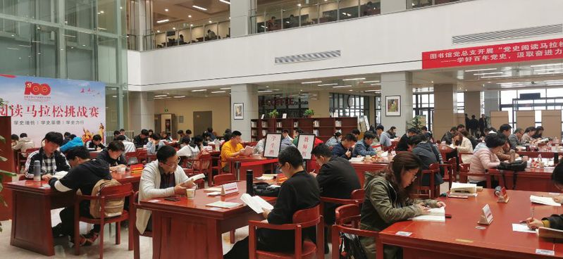 开幕式结束,党史阅读马拉松挑战赛正式拉开帷幕。比赛分教师团队组和学生个人组,共100余名参赛选手在图书馆一楼大厅就坐,共赴一场阅读盛会。