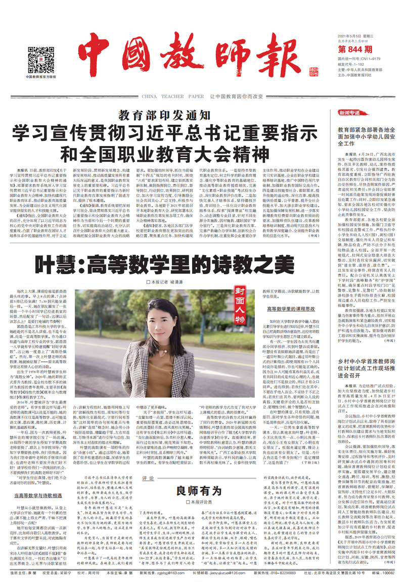 5月5日,《中国教师报》在头版“封面人物”栏目刊发专题报道,以《叶慧:高等数学里的诗教之美》为题,推介我校叶慧教授结合自身教学经验与实践积累,结合当代大学生学习特点,积极策划、灵活安排,开展大学数学课程思政教学,赋予数学基础课程诗与灵性的做法,同时配发评论员文章《良师有为》。