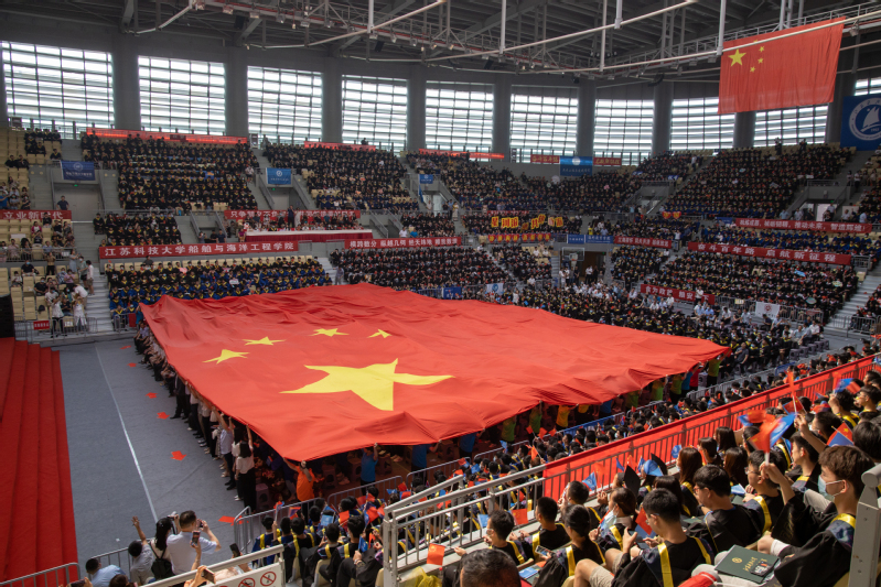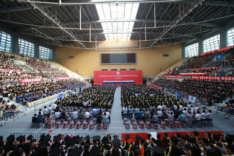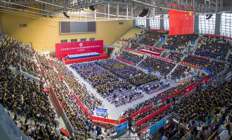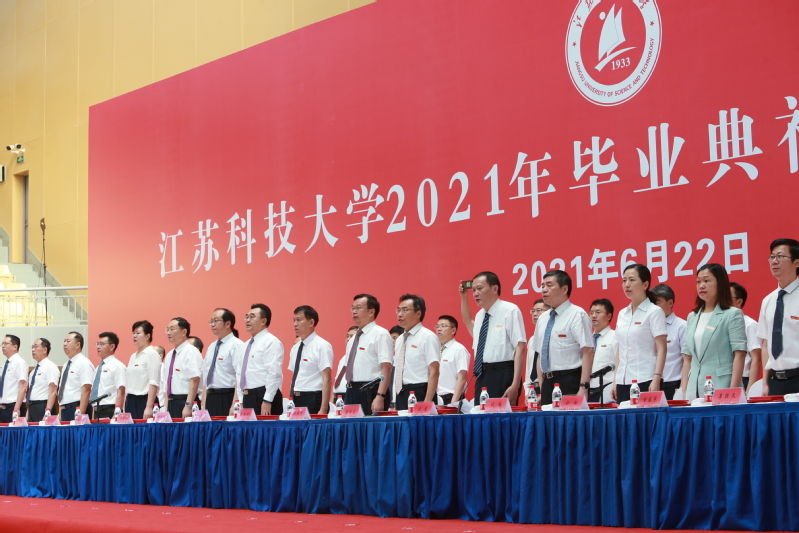 22日上午8点25分,暖场大合唱《我和我的祖国》歌声绕梁,100位志愿者护旗手共同擎举巨幅国旗走进主会场,鲜艳的五星红旗辉映着毕业生手中的校旗、手举牌,耀目的色彩衬托出青春的生动笑颜。8点30分,乐声转换,掌声雷动, 2021届毕业典礼暨学位授予仪式大幕开启,新浪、B站等多路视频通道全程直播。毕业典礼主会场设镇江大学城共享体育馆,张家港校区设置视频分会场。