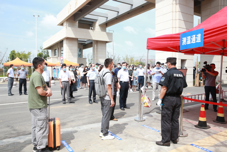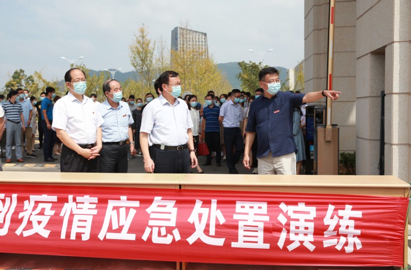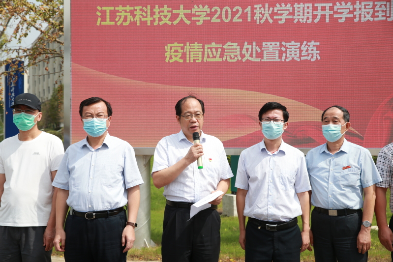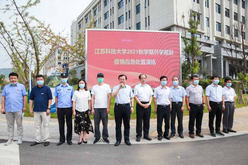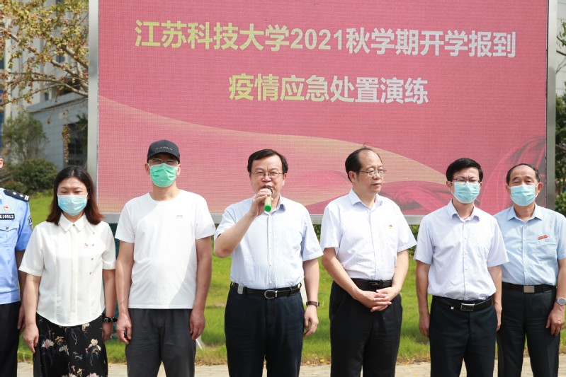 9月14日上午, 在长山校区开展2021年秋学期开学报到疫情应急处置演练。校长周南平宣布演练正式开始。校党委副书记许俊华,党委常委、宣传部长周春燕,相关职能部门以及各学院领导观摩演练,镇江市教育局、卫生监督所、派出所等有关人员现场指导,学生处副处长徐晶主持演练。