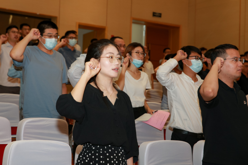 葛世伦书记为新教师代表陈凯博士颁发校徽。环境与化学工程学院陈立庄老师带领全体新教师庄严宣读《 师德公约》,激励新教师不忘教育初心、忠诚教育职业,献身教育事业。