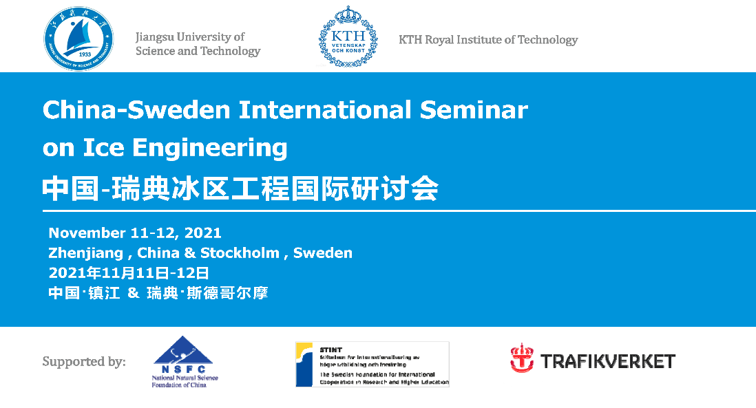 近日,由中国国家自然科学基金委(NSFC)、瑞典研究与高等教育国际合作基金会(STINT)和瑞典交通部 (TRAFIKVERKET)联合资助的“中国-瑞典冰区工程国际研讨会”(China-Sweden International Seminar on Ice Engineering)于11月11日至12日在江苏镇江和瑞典斯德哥尔摩两地同步举行。