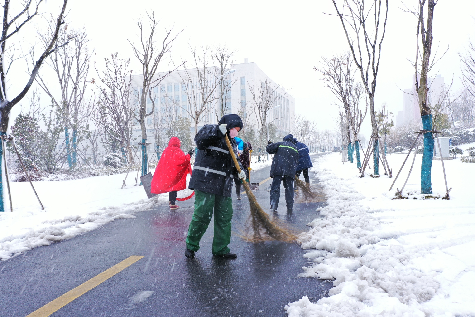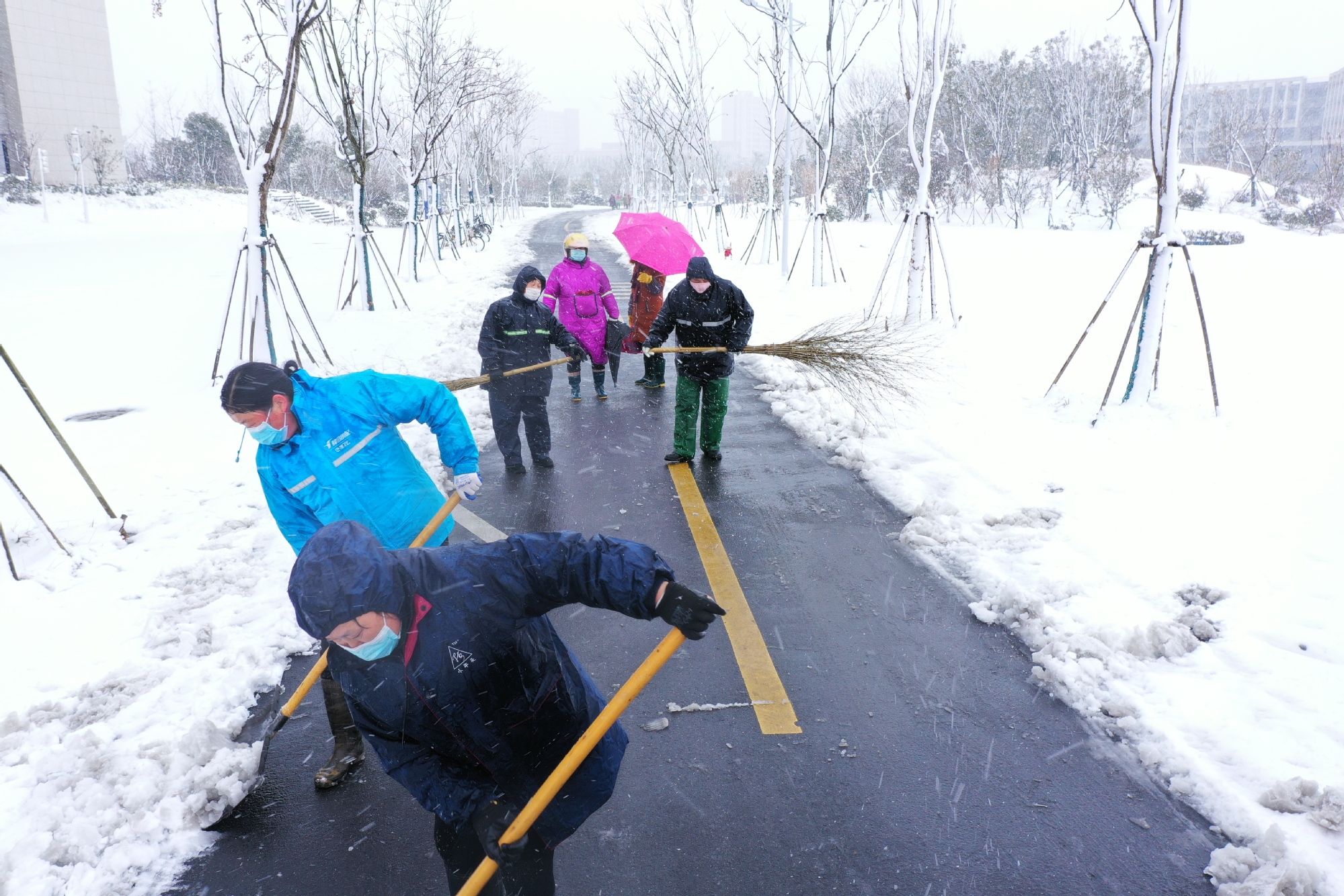 上午8:00,校园一片静谧,鹅毛大雪洋洋洒洒,后勤人行动起来,启动寒假极端天气应急预案。在后勤集团统筹下,物业中心、饮服中心会同华舟物业公司紧急调动组织了两校区120余名管理骨干、保洁人员,以校园主干道、食堂和宿舍之间、办公楼教学楼周边为重点,利用铲雪锹、扫帚等扫雪工具清理路面积雪、楼宇入口台阶,铺设草垫,并在校园主要道路上撒布了融雪盐。大家通力合作、不畏严寒,经过4个小时的奋战,校园内主要区域全部清理完毕,保证了留校师生员工的出行安全。