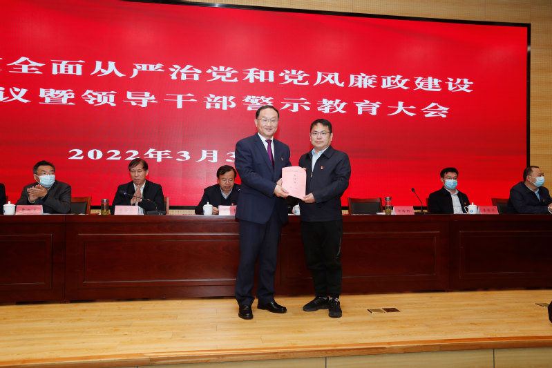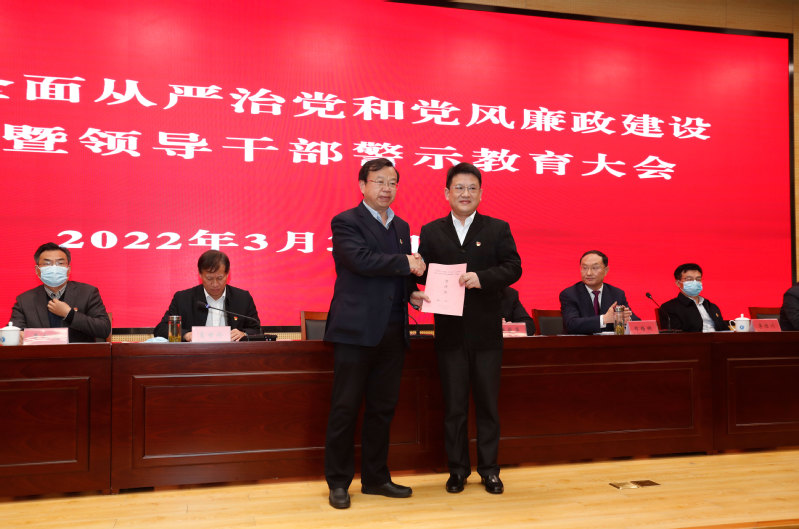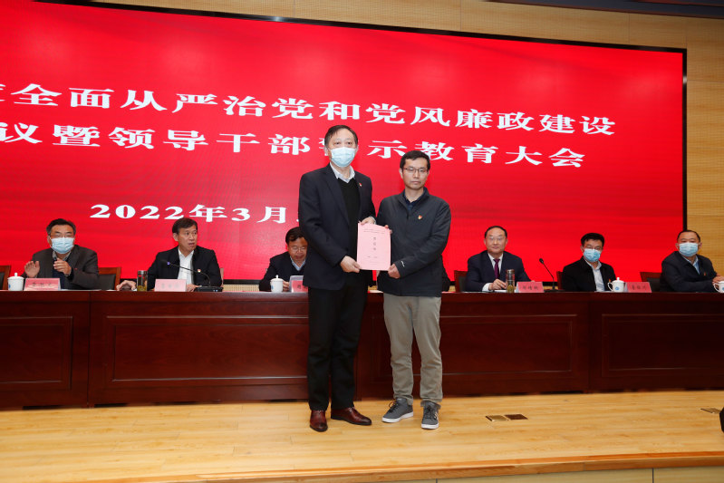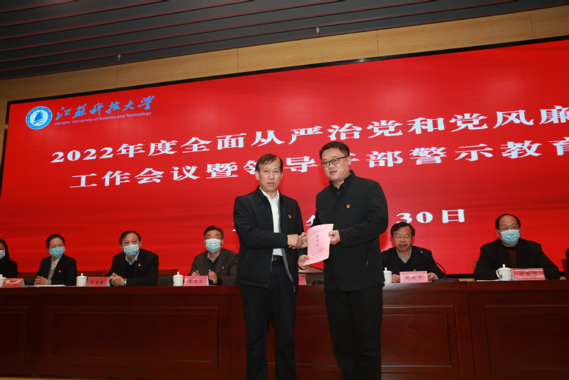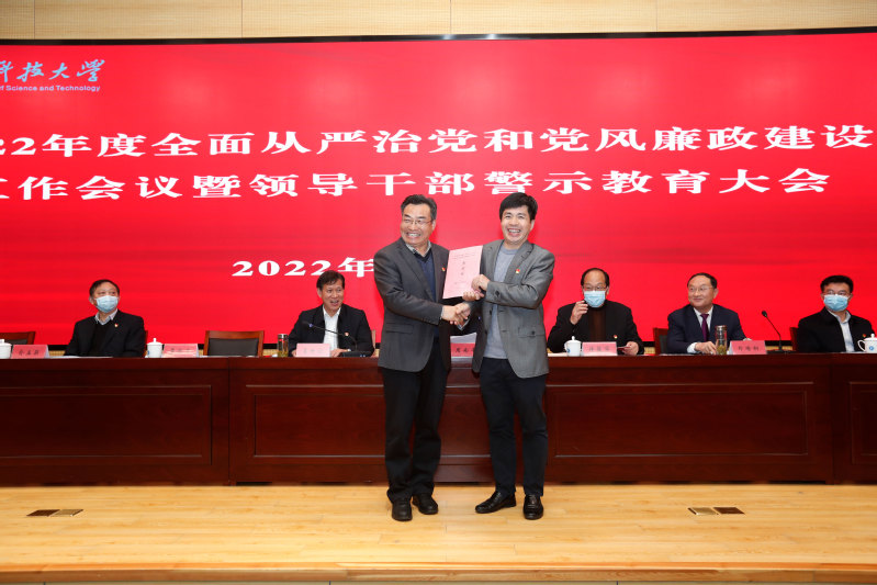 会上举行了2022年度全面从严治党和党风廉政建设主体责任责任书和“一岗双责”责任书递交仪式,二级党组织代表、学院院长和部门负责人代表分别向校党委书记葛世伦、校长周南平以及分管校领导递交了责任书。