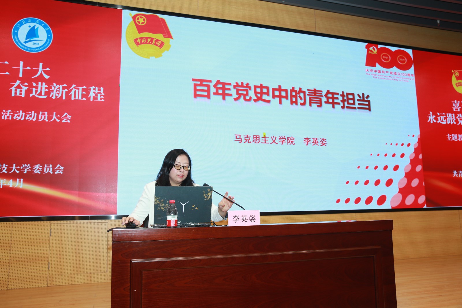 动员会现场,李英姿老师为大家主讲《百年党史中的青年担当》,带领广大团员青年重温百年奋斗的壮丽史诗,读懂中国共产党百年党史的“青春担当”,呼吁同学们将个人梦与“中国梦”紧紧地结合在一起,以更加坚定的信心、更加饱满的热情、更加努力的姿态,为实现中华民族伟大复兴的中国梦不竭奋斗、砥砺前行。
