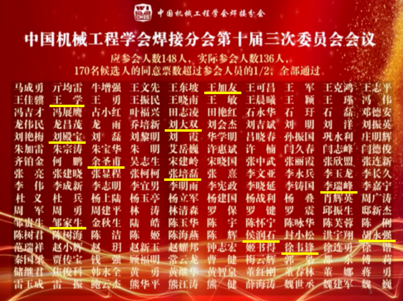 此外,我校材料学院杰出焊接校友、渤海造船厂集团有限公司刘殿宝副总工程师、杭州凯尔达机器人科技股份有限公司侯润石董事长当选焊接分会第十一届委员会常务委员,江苏雅克科技股份有限公司胡永强教授级高工、武汉大学王学教授、华中科技大学余圣甫教授、上海工程技术大学张培磊教授、合肥工业大学刘大双副教授、西北工业大学徐韦峰副教授当选中国机械工程学会焊接分会第十一届委员会委员。